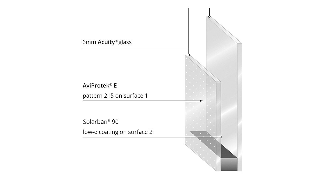 6mm Acuity® glass with AviProtek® E pattern 215 on surface 1 and Solarban® 90 low-e coating on surface 2